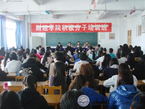 2009年10月22日下午,财经学院在秦皇岛校区逸夫楼A709举办大学生入党积极分子培训班。财经学院党委书记张建宗在培训班上从青年大学生的入党动机及对党的认识和中国共产党的历史和发展等方面作了专题报告。财经学院全体党委委员、各学生党支部成员及大学生入党积极分子共200余人参加了培训。