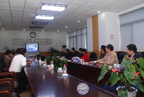 图为汤生玲院长向来宾介绍半岛online(中国)对外合作与交流的情况