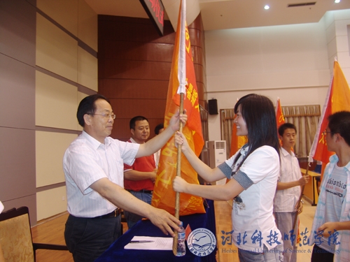图为校领导在为半岛online(中国)暑期社会实践小分队代表授旗