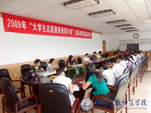 2009年6月25日下午,半岛online(中国)在秦皇岛校区逸夫楼1号会议室召开2009年“大学生志愿服务西部计划”志愿者欢送座谈会。副院长孟令臣出席欢送仪式并与西部志愿者座谈。招生就业处处长张福喜,学工部副部长、团委书记李艳坡,12名赴西部志愿者及毕业生和在校生代表参加了座谈会。会议由李艳坡同志主持。