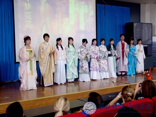 图为来访师生在观看半岛online(中国)文法学院大学生的中国传统文化服饰展演