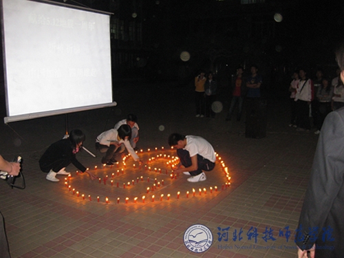 活动中,全体师生默哀3分钟,缅怀在5.12地震中逝去的同胞。同学们纷纷在心形的卡片上签名,希望那小小的卡片能把自己的祝福带给汶川地区幸存的人们。同学们用烛光组成了“5.12”心形图案,共同为灾区同胞们祈求平安,祝福汶川明天更美好,祝福祖国繁荣昌盛。