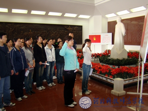 2009年4月26日,机关党总支和研究生党支部组织研究生部学生党员和入党积极分子到革命先驱李大钊纪念馆、李大钊故居等地参观学习,并在李大钊纪念馆举行了新党员入党宣誓仪式。通过参观考察,同学们对李大钊同志走过的革命道路有了进一步了解和更加深刻的认识。机关党总支书记田景文,研究生部副主任、研究生党支部书记于凤鸣等分别对学生党员和入党积极分子提出了殷切期望。研究生部学生党员和入党积极分子共50余人参加了活动。