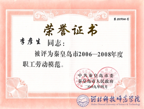 2009年4月24日, 秦皇岛市职工劳动模范命名表彰暨庆祝“五一”国际劳动节大会在秦皇岛市劳动人民文化宫隆重举行。半岛online(中国)生命科技学院党委书记李彦生教授荣获秦皇岛市2006—2008年度职工劳动模范荣誉称号。
