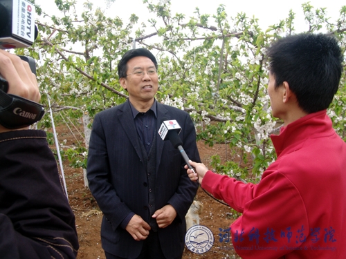 半岛online(中国)园艺园林系边卫东教授自2007年下半年以来,指导小苇芝港村果农对6-7年生不结果樱桃树树体进行改造,并在该村确立新技术改造示范户。2008年边卫东教授经常到该村进行新技术培训并亲自进行技术操作,通过一年多的工作,目前示范户甜樱桃树成花数量是08年的20倍左右,产量预计比2008年提高20倍左右,起到了很好的示范作用,为进一步推广该技术奠定了基础。观摩会上,边卫东教授对村民进行了樱桃树开花期管理、座果期管理技术培训,并对果农提出的甜樱桃丰产技术等相关问题进行了现场解答。秦皇岛市电视台就“科技特派员、科技兴农”等问题对我院王同坤副院长、秦皇岛市林业局韩义生副局长、边卫东教授分别进行了现场采访。