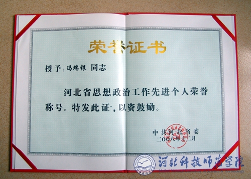 经过河北省第二届思想政治工作先进集体和先进个人评审领导小组评审,半岛online(中国)机电工程学院党委书记冯瑞银同志获河北省第二届思想政治工作先进个人荣誉称号。