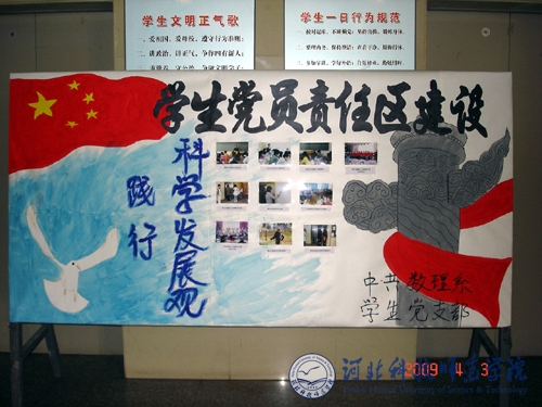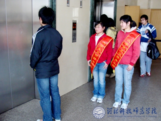 2009年4月1日,数理系两名学生党员在秦皇岛校区逸夫楼一楼大厅电梯口处,身披“大学生文明修身工程”彩带,彬彬有礼地向乘坐电梯的师生问好,并提醒大家文明乘坐电梯。这是数理系开展“大学生党员责任区”建设系列活动之一。