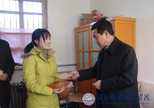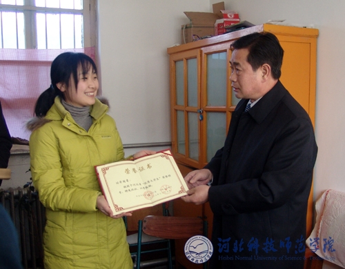 图为刘教民厅长在向付华同学颁发“河北省优秀大学生”荣誉证书