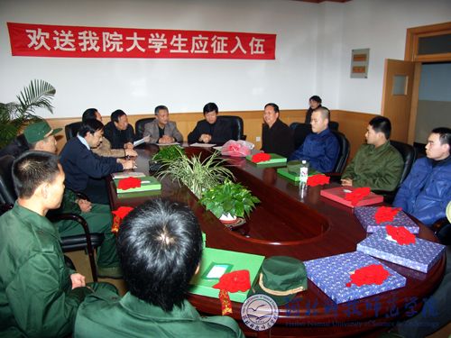 2008年12月10日,我院在秦皇岛校区召开应征入伍大学生欢送会。院党委书记石千峰,党委副书记、院长汤生玲,党委副书记陈继生,副院长、武装部政委孟令臣出席会议。保卫处处长、武装部部长胡志杰以及保卫处相关部门负责同志与10名应征入伍的大学生参加了欢送会。欢送会由胡志杰同志主持。