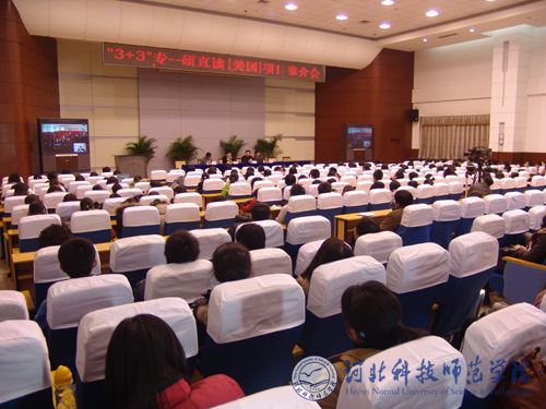 2008年12月5日,我院与美国特洛伊大学(Troy University)“3+3”专—硕直读(美国)项目推介会在我院秦皇岛校区、昌黎校区和开发区校区通过视频会议系统同时举行,会议主会场设在秦皇岛校区。中国国际青年交流中心主任阎学谦,中国国际青年交流中心处长李伟,学院党委副书记、院长汤生玲,教务处处长、国际合作与交流处处长李佩国出席会议。我院相关各系(部)的领导和老师以及专科学生共300余人参加了会议。