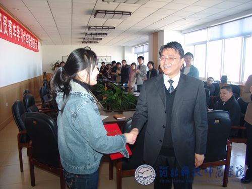 图为团市委书记焦大伟向付华同学颁发“秦皇岛市自立自强优秀大学生”荣誉证书并与其亲切握手