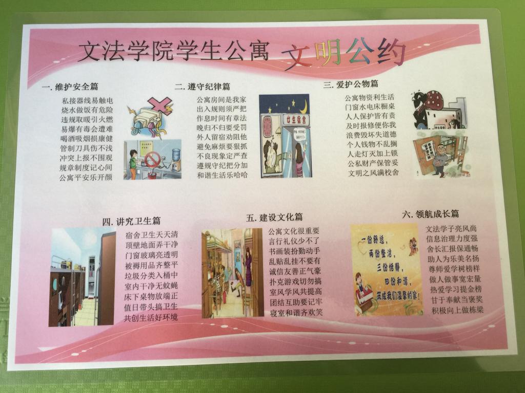 “文法学子亮风尚,信息治理力度强,舍长汇报保通畅,助人为乐美名扬……”《文法学院学生公寓文明公约》以学生喜闻乐见的顺口溜形式亮相文法学院各个宿舍,这是学院为了促进学生的宿舍文明行为养成想出的新招。