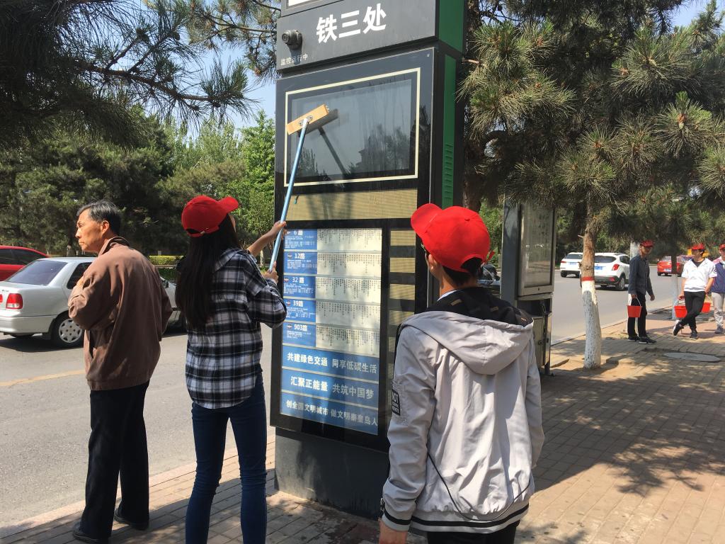 活动于27日下午2点正式开始,城建学院志愿者负责的是山东堡立交桥至森林逸城路段,需要把该路段的所有公共设施,如公交站牌、垃圾箱、公共自行车停放处等设施清洗干净。全体志愿者顶着烈日骄阳,认真的清洗每一处污渍和灰尘。