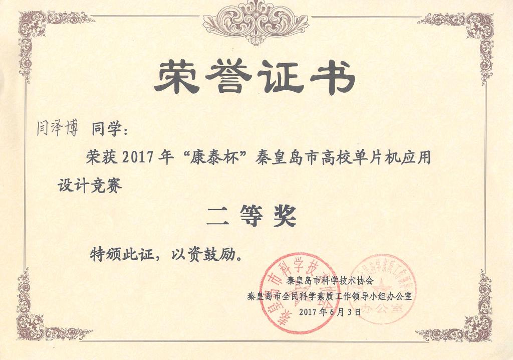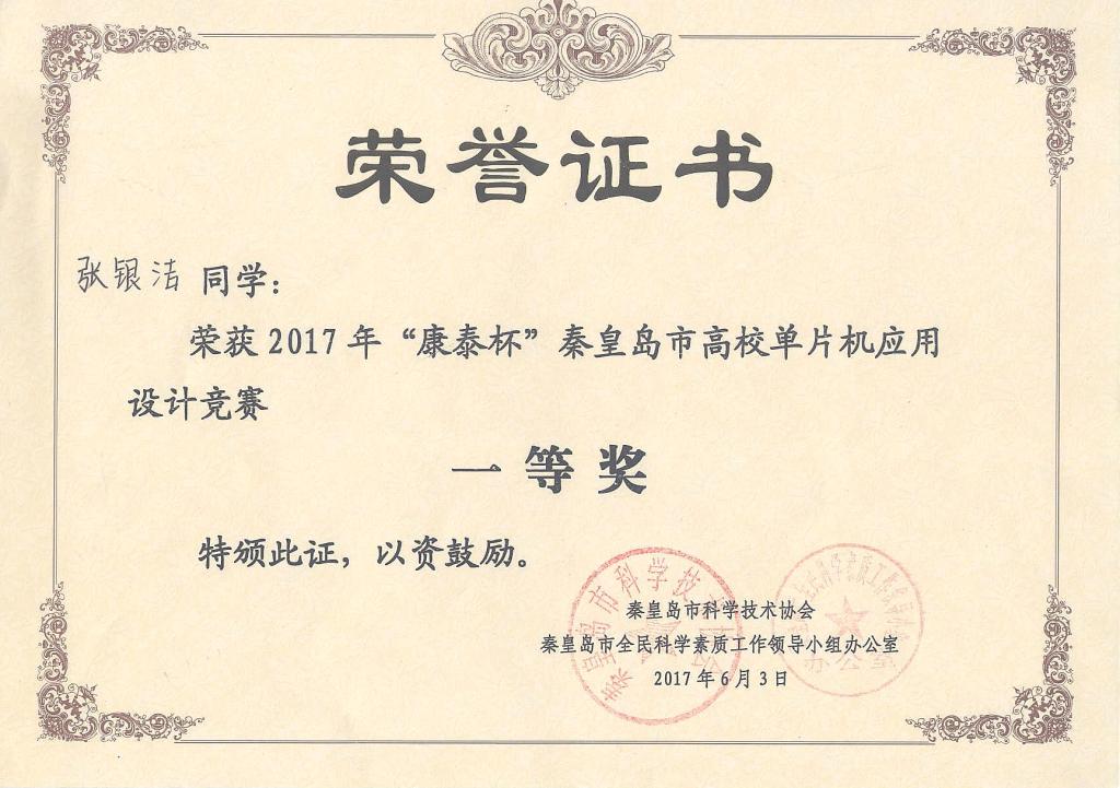 近日,机电工程学院学生在秦皇岛市科学技术协会和秦皇岛市康泰医疗系统有限公司共同主办的“康泰杯”秦皇岛市高校单片机应用设计竞赛中,14电气专业张银洁同学获得一等奖,15农机专业郝广等两名同学荣获得二等奖,15电气刘东明等三名同学获得三等奖。(编辑:孙艳敏 审核:李学锋)
