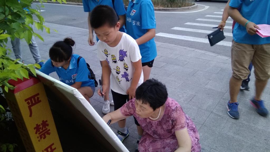 随后,队员们向每位居民发放“创城”宣传材料,邀请居民在宣传板上写下创城标语或者倡导文明的话语。居民们积极配合,踊跃书写。有些小朋友好奇地张望着宣传板,队员们耐心地跟他们讲解并巧妙地让他们自己说出至少一条文明行为,手把手教他们写下文明条列。如此一来,宣传板很快“硕果累累”。