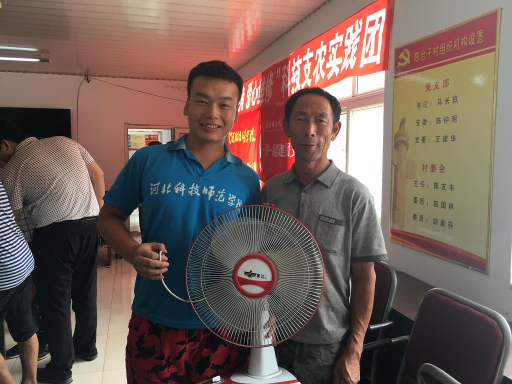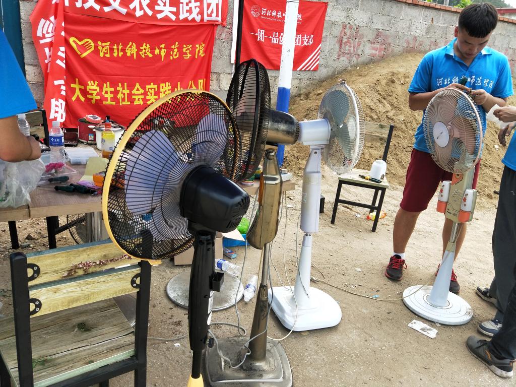 从实践队员们到达的第一站张庄开始,热情就从未减退。在那个名叫“活动中心”的小小空地中临时搭起的简陋帐篷里,顶着炎炎烈日,埋头苦干。与烈日形成强烈对比的莫过于那一排摆动着头的电扇。村民解说,那都是队员们修好的,因为天气炎热,同时村民们想表达自己的感激之情,就不约而同地将电扇留在那里,为队员们送上一丝清凉。