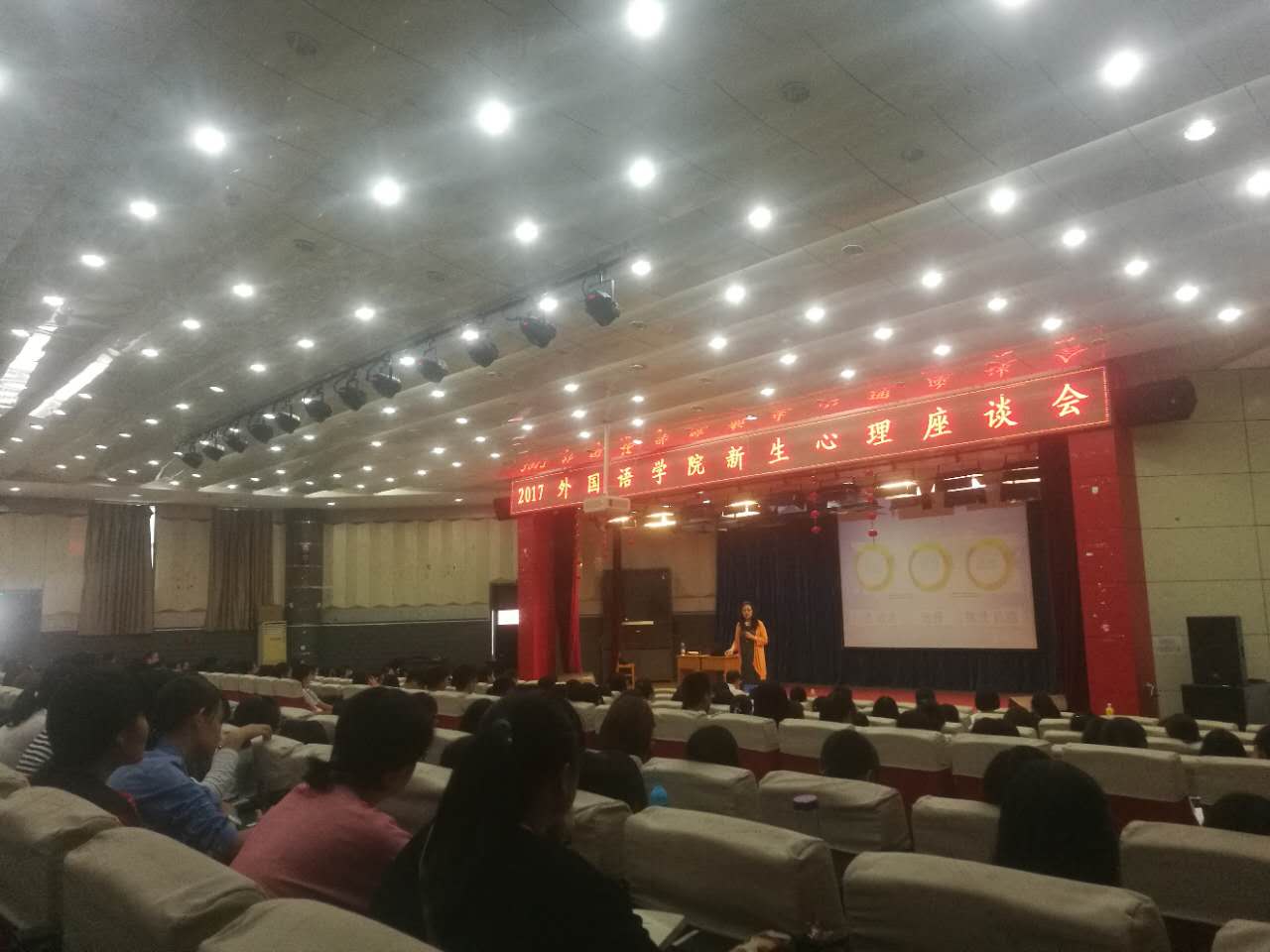 为了帮助2017新生适应大学生活,以健康的心态顺利融入新集体、新生活,外国语学院特邀半岛网页版界面大学生心理健康和咨询中心副主任丁书新老师于9月15日上午8:30在综合楼二楼报告厅举行2017级外国语学院心理健康教育讲座。学院学工办老师、2017级辅导员班主任、337名新同学参加了心理健康教育讲座。