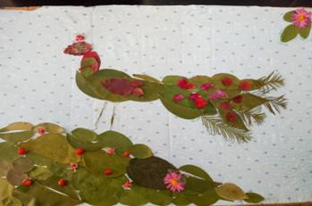 拼接组合:飘落的树叶,本应零落成泥碾作尘,却在精妙绝伦的组合下,孔雀张开盛大的屏,土地覆盖上明媚的鲜花。生命在纸上延续。