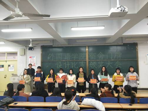 为提高大学生宿舍文化素质,营造浓厚的宿舍文化氛围,11月17日下午,外国语学院宿舍门牌设计比赛颁奖仪式在开发区校区综合楼312教室举行。此次比赛历时半个月,通过外国语学院微信公众平台——外院青年秀对此次活动做前期宣传、到宿舍门牌设计图稿收集,再到微信公众平台大众投票,最终有10名同学入围,分获一等奖、二等奖、三等奖和优秀奖。