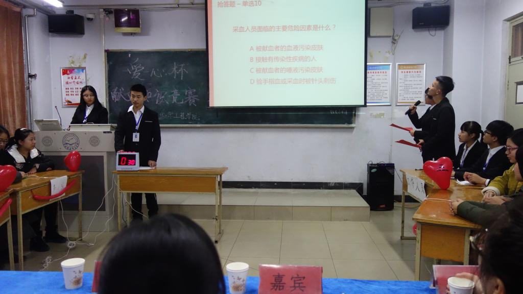 2017年11月30日,化学工程学院在1-C102举办了“爱心杯”献血知识竞赛复赛,化学工程学院团委负责人及50名学生参与了本次活动。