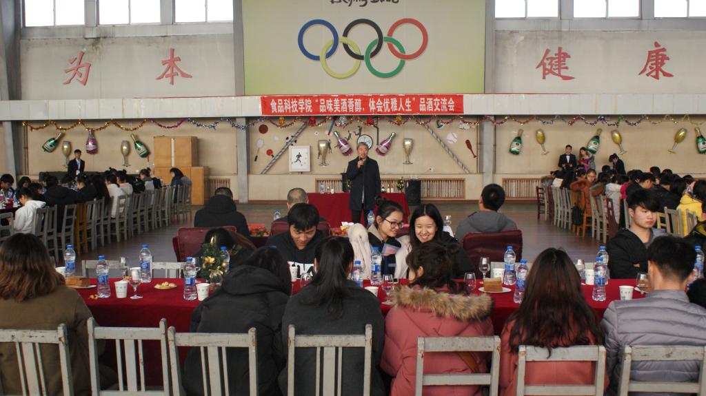 2017年12月24日下午两点半,食品科技学院在昌黎校区体育馆举办了以“品味美酒醇香,体会优雅人生”为主题的葡萄酒品鉴交流会,此次活动是食品文化节系列活动之一。出席本次交流会的有中粮华夏葡萄酒有限公司部门经理国家一级品酒师蒋文红、食品科技学院党政负责人、酿酒工程教研室老师和酿酒专业一、二、三年级的全体在校学生。
