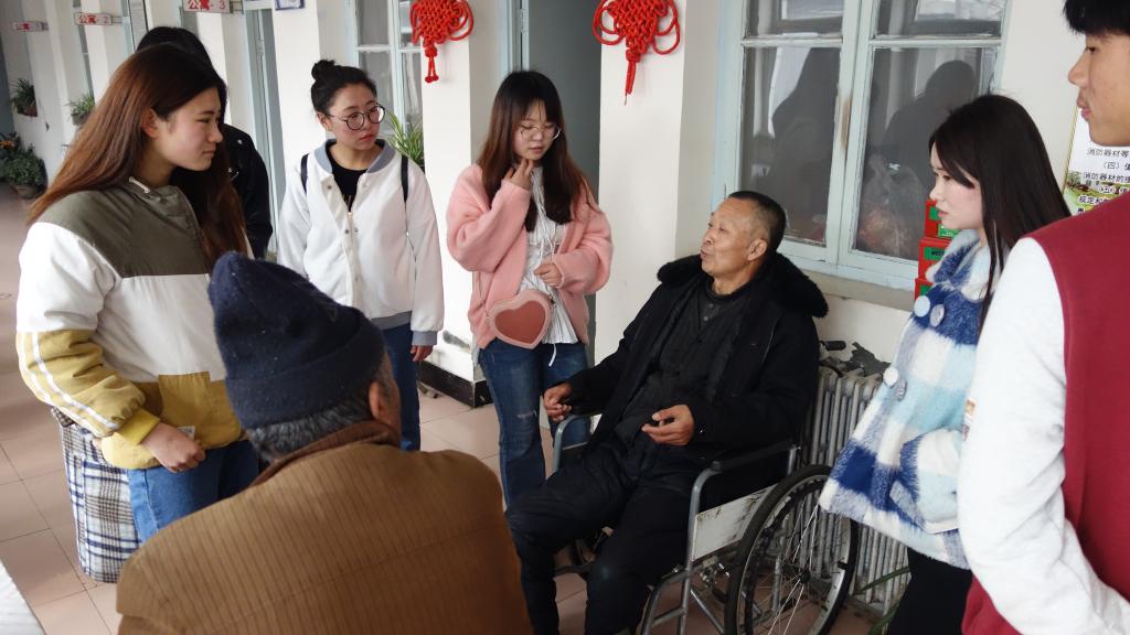 志愿者分成几组与老人们亲切交谈、深入交流,了解老年人的对生活的理解,对亲人的挂念、对国家社会的关心。老人们更多的是回忆自己的过去,用自己的经历来鼓励同学们在年青时要好好努力,告诫大学生一定要珍惜青春年华,不能辜负人生最美好的时光。期间,志愿者们还给老人们表演舞蹈、歌曲等节目。