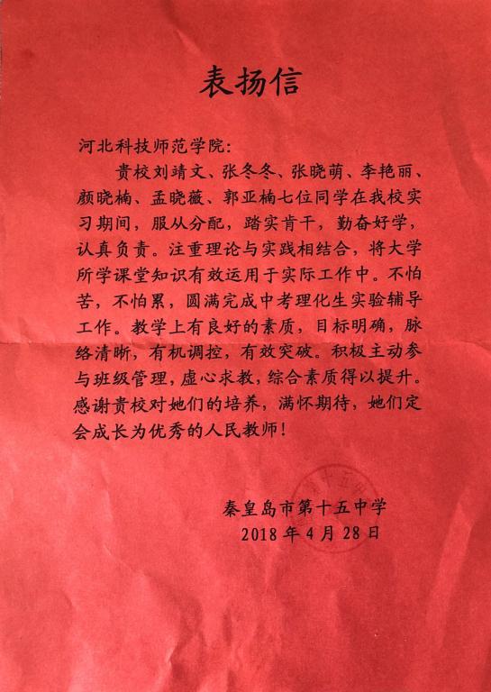 近日,秦皇岛市第十五中学为半岛online(中国)送来了表扬信,对文法学院7名学生在实习工作中的表现提出了表扬。