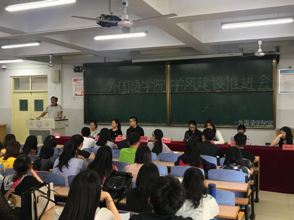 为推进外国语学院学风建设,巩固“无手机课堂”、“课堂桌牌制”、“诚信考场”、“微学习”等特色学风建设活动,外国语学院于9月20日在综合楼312教室召开了学风建设推进会。学院党委负责同志、全体辅导员、班主任、全体班干部等150多人参加会议。