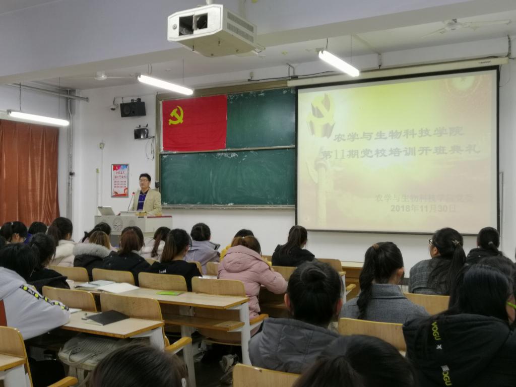 2018年11月30日,农学与生物科技学院党委第11期党校培训班举行开班典礼。培训班以《端正动机,加强修养,向党看齐》和《坚定四个自信,保持战略定力》为题,面向120名参训学员开展党课讲座。