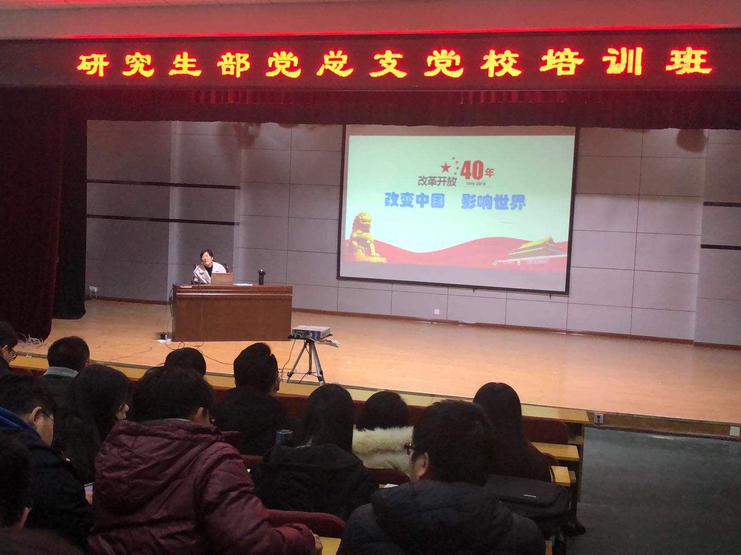 开班仪式后,王向华教授、吴子国教授、王玉芬教授和研究生部党总支负责人分别作了“改革中国,影响世界”、“苦难辉煌与理想信念”、新时代毫不动摇坚持和发展中国特色社会主义”、“怎样成为一名合格的共产党员”的主题报告。