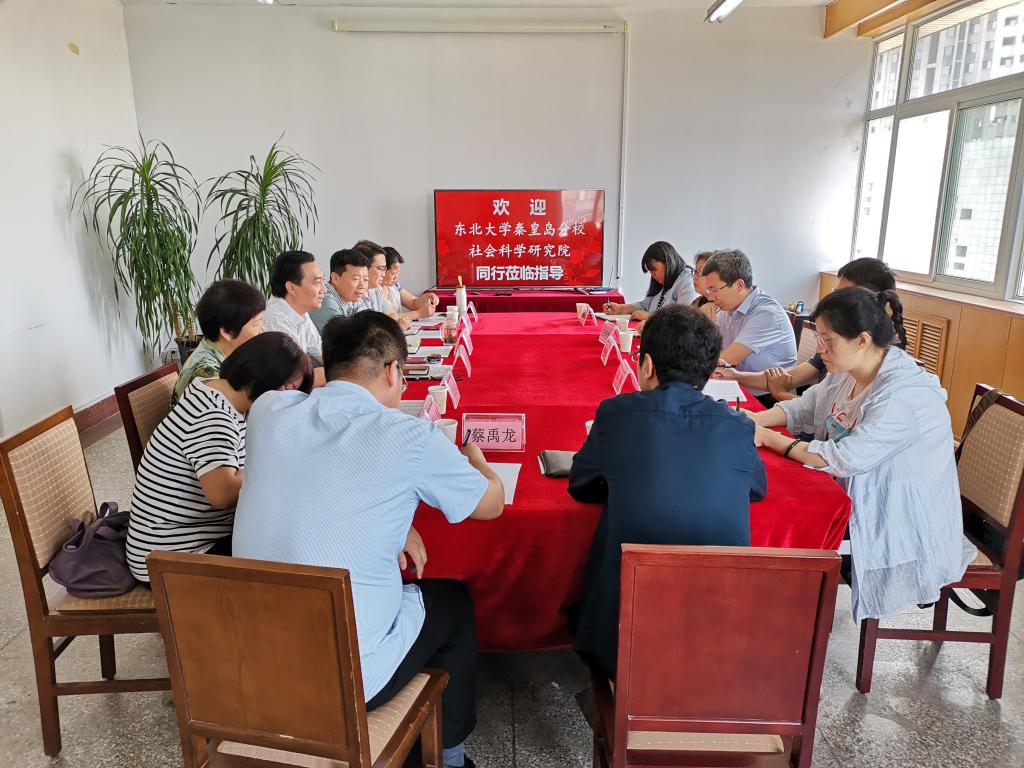 2019年6月12日上午,东北大学秦皇岛分校社会科学研究院副院长董劭伟(主持工作)一行五人到半岛online(中国)思政部调研交流。思政部班子成员、各教研室主任参加座谈,思政部党务负责人主持会议。