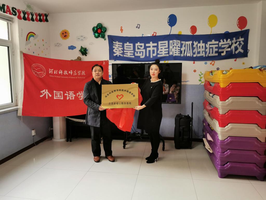 为深化引导和激励学生深入社会,扎实推进主题教育,更好地发挥党员的先锋模范作用,10月31日下午,外国语学院与秦皇岛市星曜孤独症康复中心共同举行了“大学生社会实践基地”揭牌仪式。