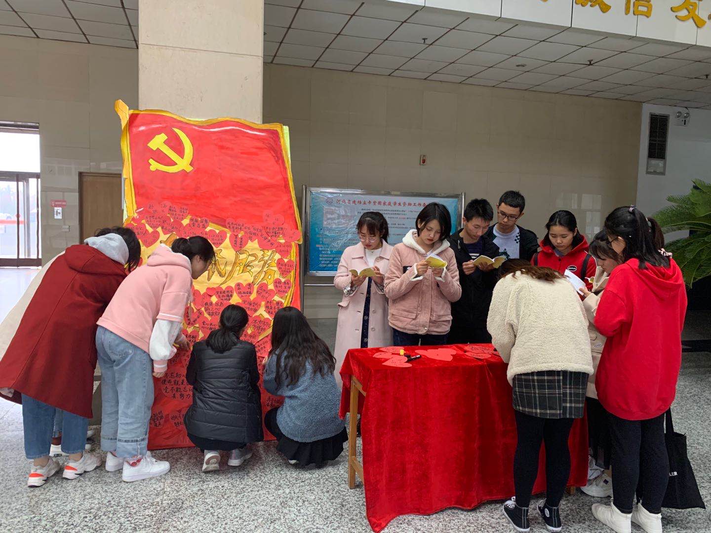工商管理学院师生历时五个小时,手绘党旗党徽,他们用行动号召更多青年向党言心志,他们将“不忘初心,牢记使命”主题教育精神薪火相传。学生党员手持《“不忘初心,牢记使命”主题教育学习手册》向校园里来来往往的同学们讲解“不忘初心,牢记使命”主题教育相关知识,使更多的同学对主题教育有了更多的认识,并号召同学们写下留言,一起向党言心志:“我将以赤诚之心紧跟党走”“传承党训,砥砺前行”“守其初心,始终不变,小水长流,则能穿石”“这是一个伟大的时代,涓涓努力都向着大海涌流”“不忘初心牢记使命将青年梦融入中国梦”……