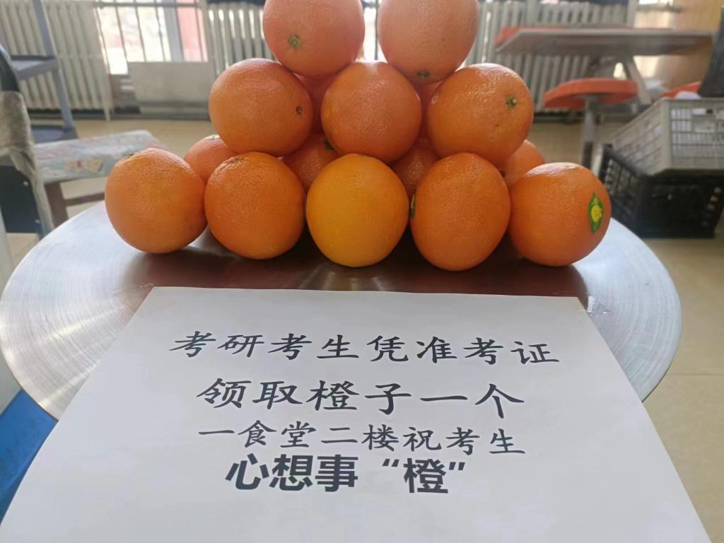 近日,在冬至和研究生招生考试来临之际,大学生服务中心以“温情、温暖、温馨,成长、成才、成功”为主题,精心组织策划了为期两天的第二届“心想事“橙”活动,为3000名考研学生送上暖心橙子,用这份专属“橙”意祝福大家心想事“橙”、一战“橙”硕、马到“橙”功,由食堂工作人员将一份份祝福亲手逐一送达,暖心叮嘱学生“做好防护,增强抵抗力”,并祝福考研学子成功上岸。