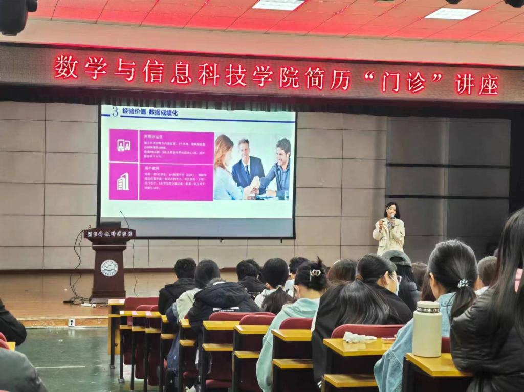 2024年4月11日,数学与信息科技学院举办“职引未来,简历先行”主题简历门诊讲座。企业资深人力资源经理、职业规划师王娜应邀主讲,学院全体辅导员,2024届、2025届本科毕业生参加了活动。