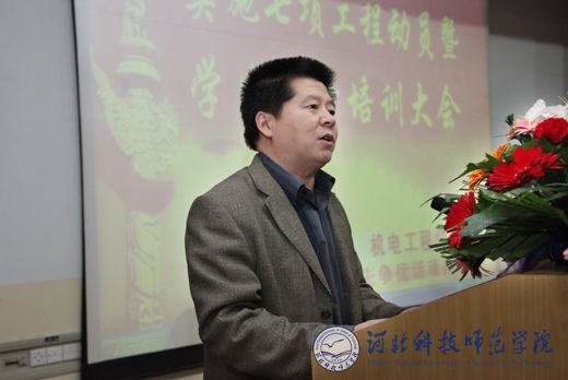 2010年11月18日下午,机电工程学院在昌黎校区学术报告厅召开实施七项工程动员暨学生骨干培训大会。校创先争优活动领导小组办公室副主任、党委宣传部部长赵宗宝应邀出席会议。冯瑞银、刘荣昌、包长春、邓春岩、王庆祝等学院负责同志以及学院全体教师、学生干部、学生党员、入党积极分子和大学生代表等共500余人参加了会议。