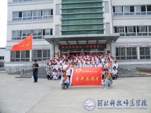 图为志愿者在秦皇岛开发区第一中学楼前合影
