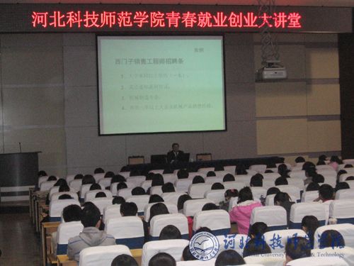 2010年4月15日下午,校团委“青春就业创业大讲堂”活动在秦皇岛校区学术交流中心举办。本期讲座的主讲人孙贺明先生为秦皇岛富尼通特智能科技有限公司总监,他曾获得多项国家发明专利,社会工作经验丰富,此次讲座的主题是大学生创业就业心理素质。